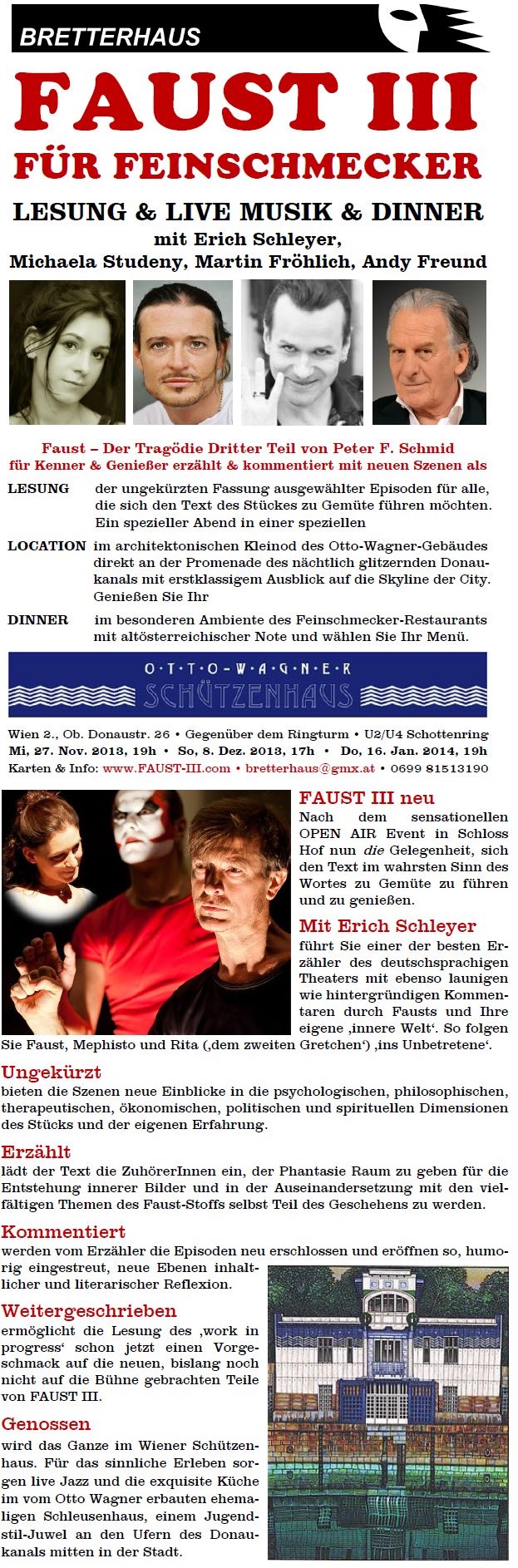 FAUST III FÜR FEINSCHMECKER 27. 11. und 8. 12. 2013 Zusatztermin 16. 1. 2014 im Otto Wagner Schützenhaus Lesung und Dinner mit ERICH SCHLEYER und dem Team von FAUST III für Kenner und Genießer neu erzählt mit neuen Szenen ![]() Nähere Infos hier Zur Kartenbestellung |